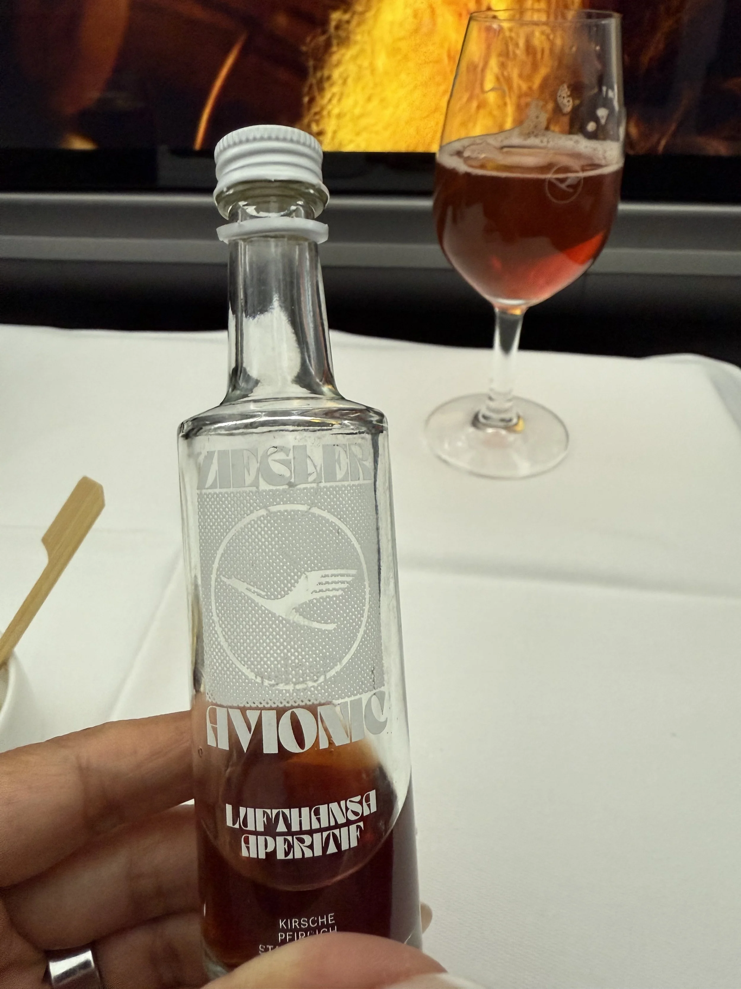 Okay, food is definitely not where Lufthansa shines—whether you’re flying out of SFO or MUC. I hate to say it, but the food was just meh. I’d call it edible at best. That said, their signature aperitif called “Avionic,” is so good it might just be worth booking business class for that alone (it’s only offered in business class!).